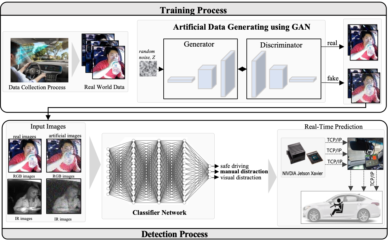 In this project, we proposed a computationally efficient frame work that comprises a generative adversarial network (GAN) and convolutional neural network (CNN) framework for real time distracted driver detection during both day and nighttime conditions. The proposed system is composed of two consecutive steps.